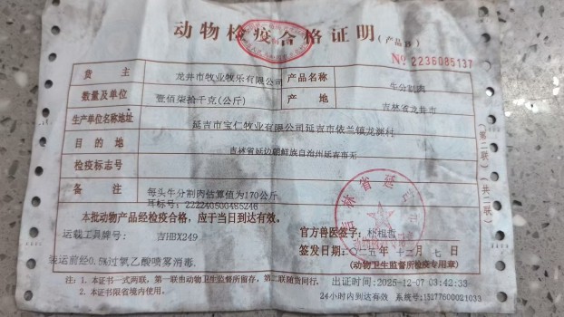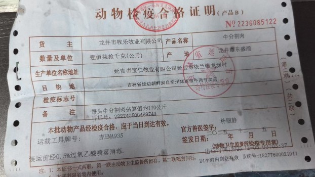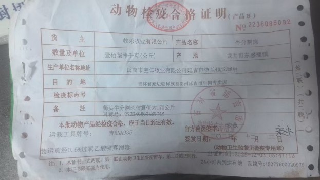 屠宰场名称:延吉市宝仁牧业有限公司肉牛屠宰场